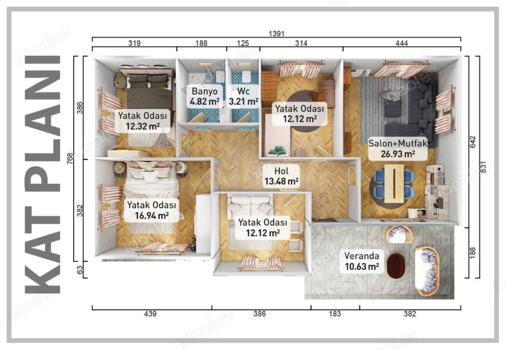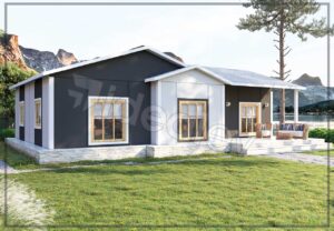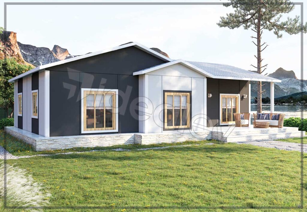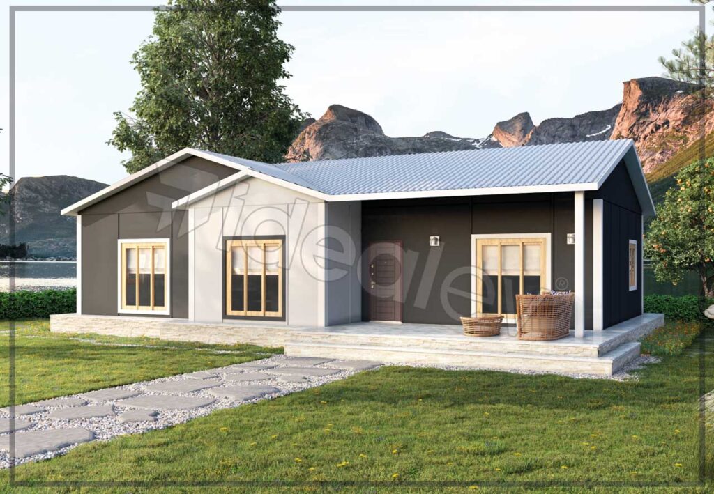 Our 113 m2 4+1 bedroom Large model can be built quickly thanks to the prefabricated construction technology. It is the most efficient in terms of space utilisation compared to other buildings in the same category. The building has three 12 m2 bedrooms, one 17 m2 bedroom and a 27 m2 living room with American style kitchen and bathroom. It is ideal for beginners, but also offers comfortable living for larger families. It can be built with an accessibility system if required.