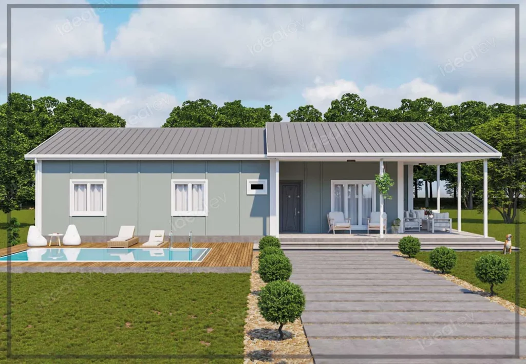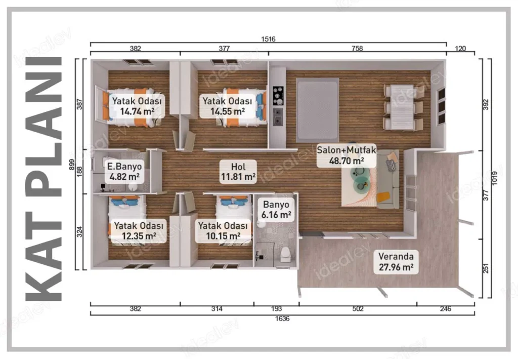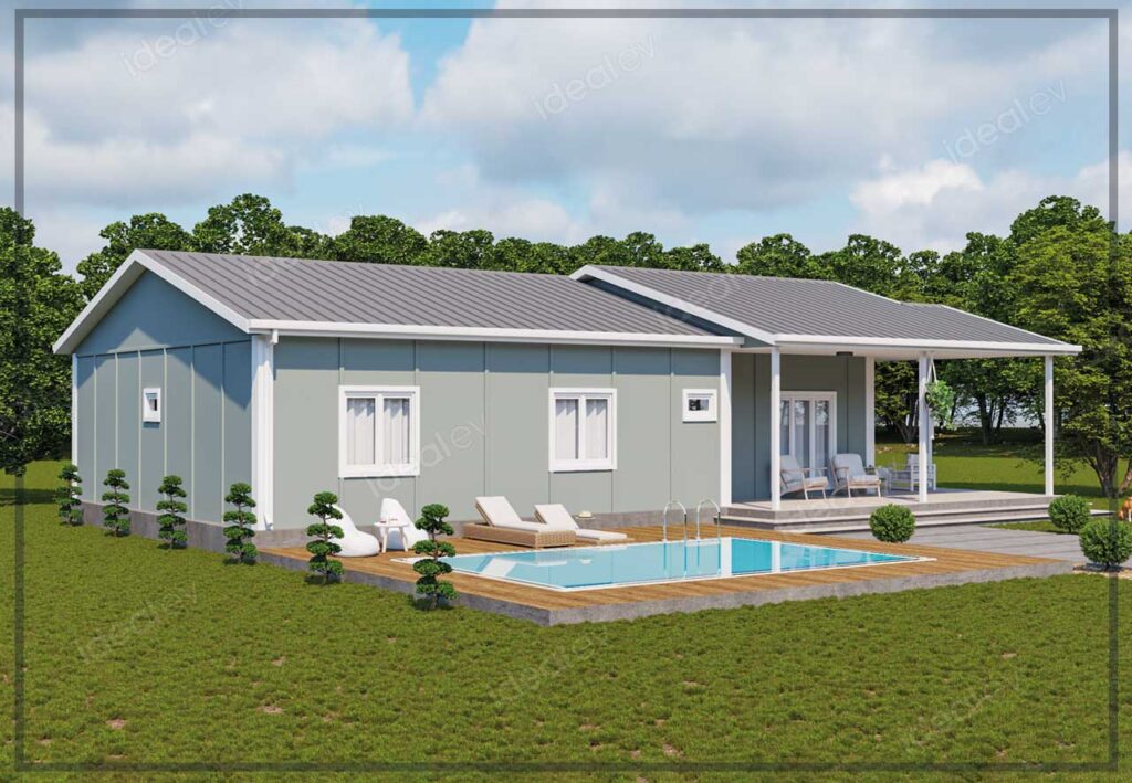 Our 151 m2 4+1 bedroom Large model can be built quickly thanks to the prefabricated construction technology. It is the most efficient in terms of space utilisation compared to other buildings in the same category. The building has two bedrooms of 14 m2, one of 12 m2 and one of 10 m2, as well as a 27 m2 living room with American style kitchen and bathroom. It is ideal for beginners, but also offers comfortable living for larger families. It can be built with an accessibility system if required.